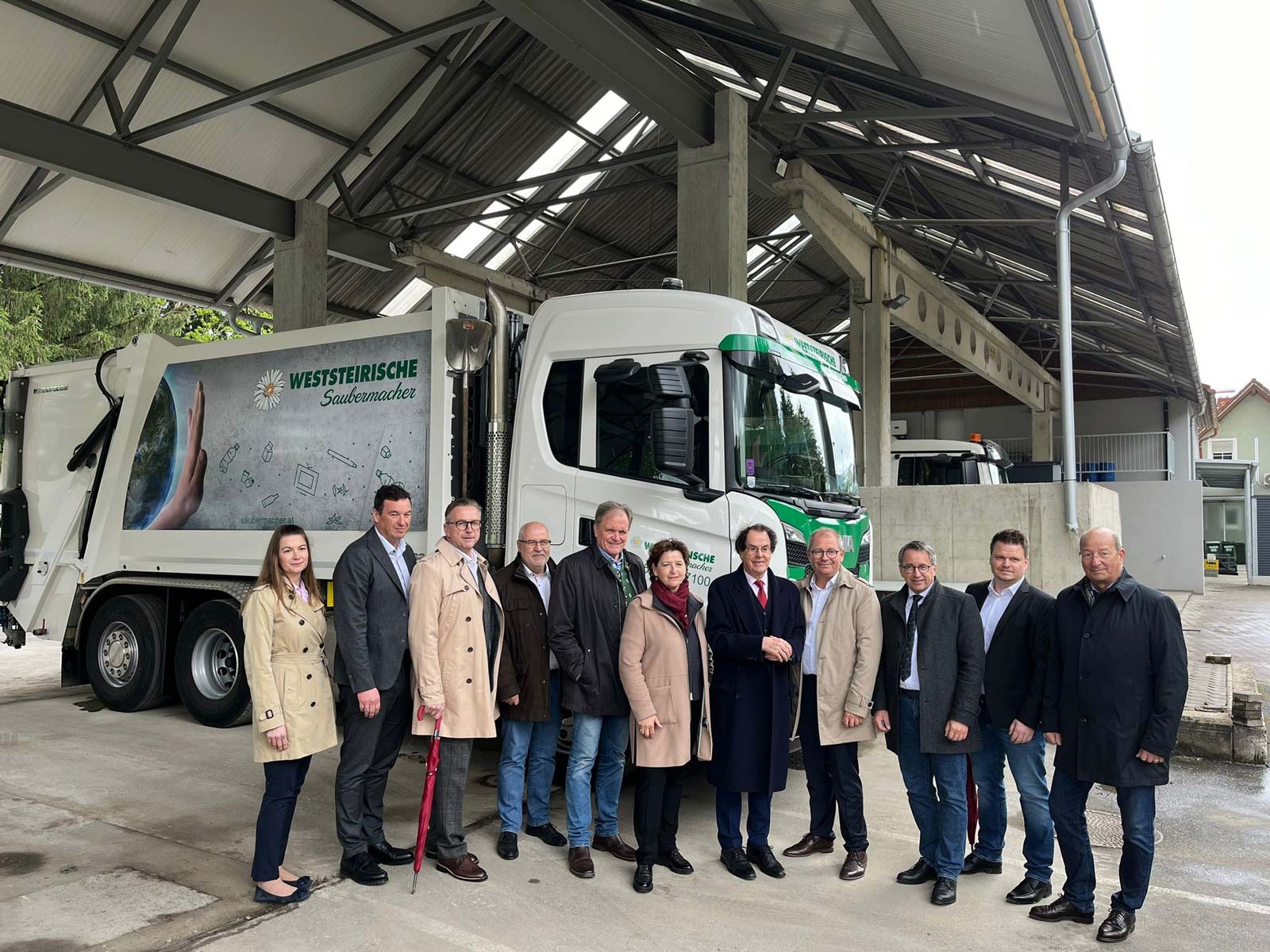 Foto von links nach rechts: Stefanie Köberl, Saubermacher Geschäftsleiterin Österreich; Jochen Bocksruker, Bürgermeister Stadtgemeinde Bärnbach; Helmut Linhart, Bürgermeister Stadtgemeinde Köflach; Kurt Riemer, Bürgermeister Marktgemeinde Maria Lankowitz; Erwin Dirnberger, Abgeordneter zum Steirischen Landtag; Ursula Lackner, Landesrätin Steiermark; KR Hans Roth, Saubermacher Gründer; Bernd Osprian, Bürgermeister Stadtgemeinde Voitsberg; Johannes Schmid, Bürgermeister Gemeinde Rosental an der Kainach; Christopher Cech, Betriebsleiter Weststeirische Saubermacher GmbH; Josef Kriegl, Geschäftsführer Weststeirische Saubermacher GmbH. Foto: Saubermacher.