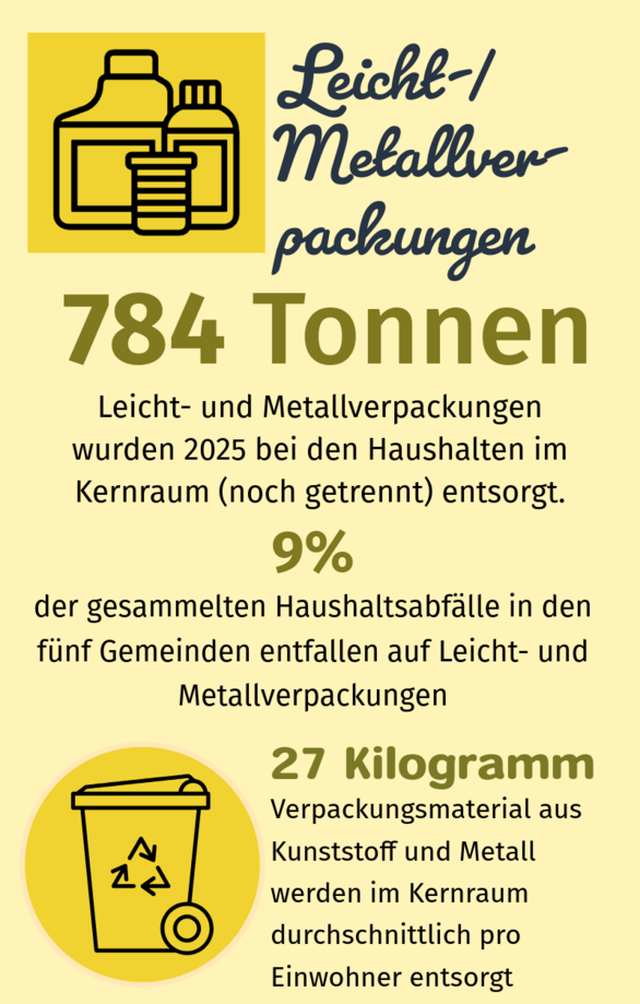 Diese Sammlung erfolgt im Rahmen des Sammel- und Verwertungssystems der Altstoff Recycling Austria (ARA). In unseren fünf Gemeinden stehen dafür rund 5.500 Sammelbehälter zur Verfügung, die in einem drei- bis sechswöchigen Rhythmus geleert werden. Zusätzlich erhalten Bürger:innen Gelbe Säcke zur Entsorgung von Leicht- und Metallverpackungen. Jährlich werden etwa 6.500 Gelbe Säcke direkt bei den Haushalten in unserem Abfuhrgebiet abgeholt.