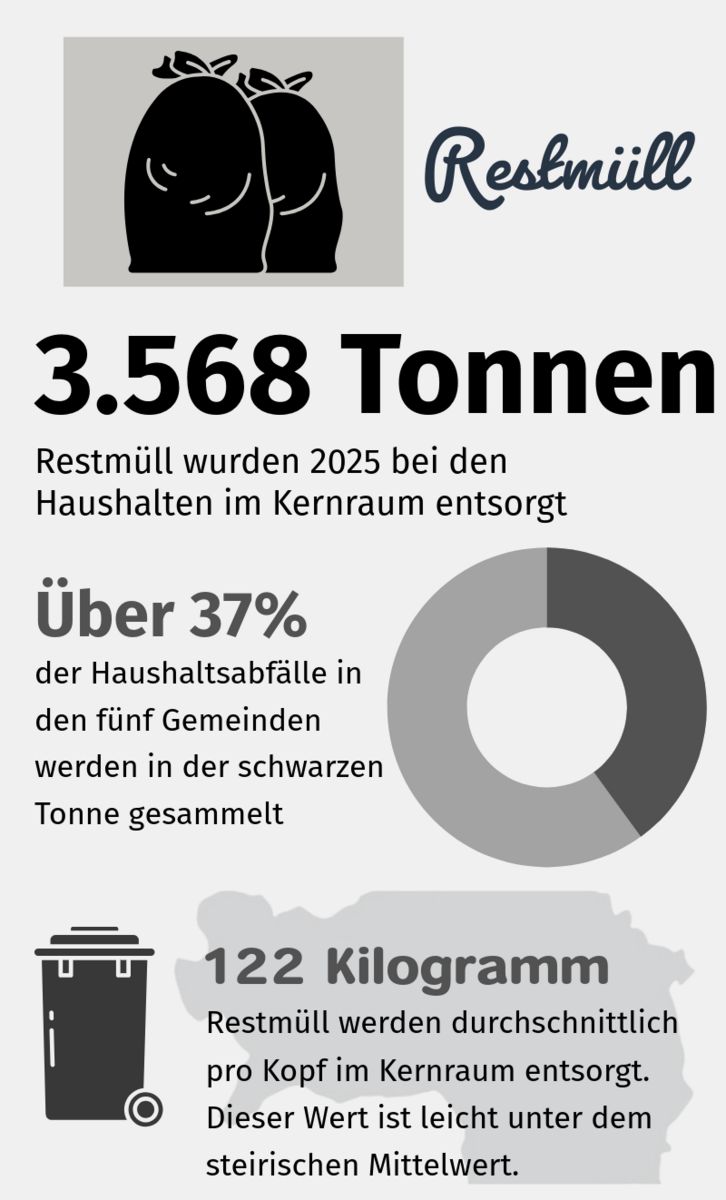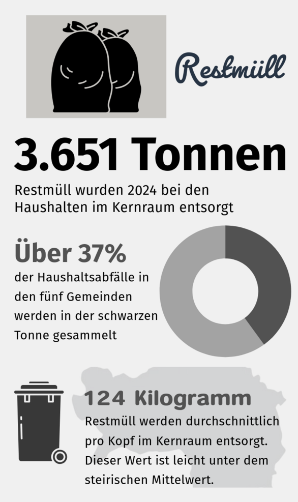 Durch die starke Verschmutzung im Restmüll ist eine stoffliche Verwertung nicht mehr möglich. Die Restmüllanalyse des Landes Steiermark zeigt, dass weniger als ein Drittel des Restmülls korrekt entsorgt wird. Ein Drittel besteht vor allem aus Abfällen für die Altstoffsammlung, wie Papier, Textilien und Verpackungen. Ein knappes weiteres Drittel sind kompostierbare Abfälle.